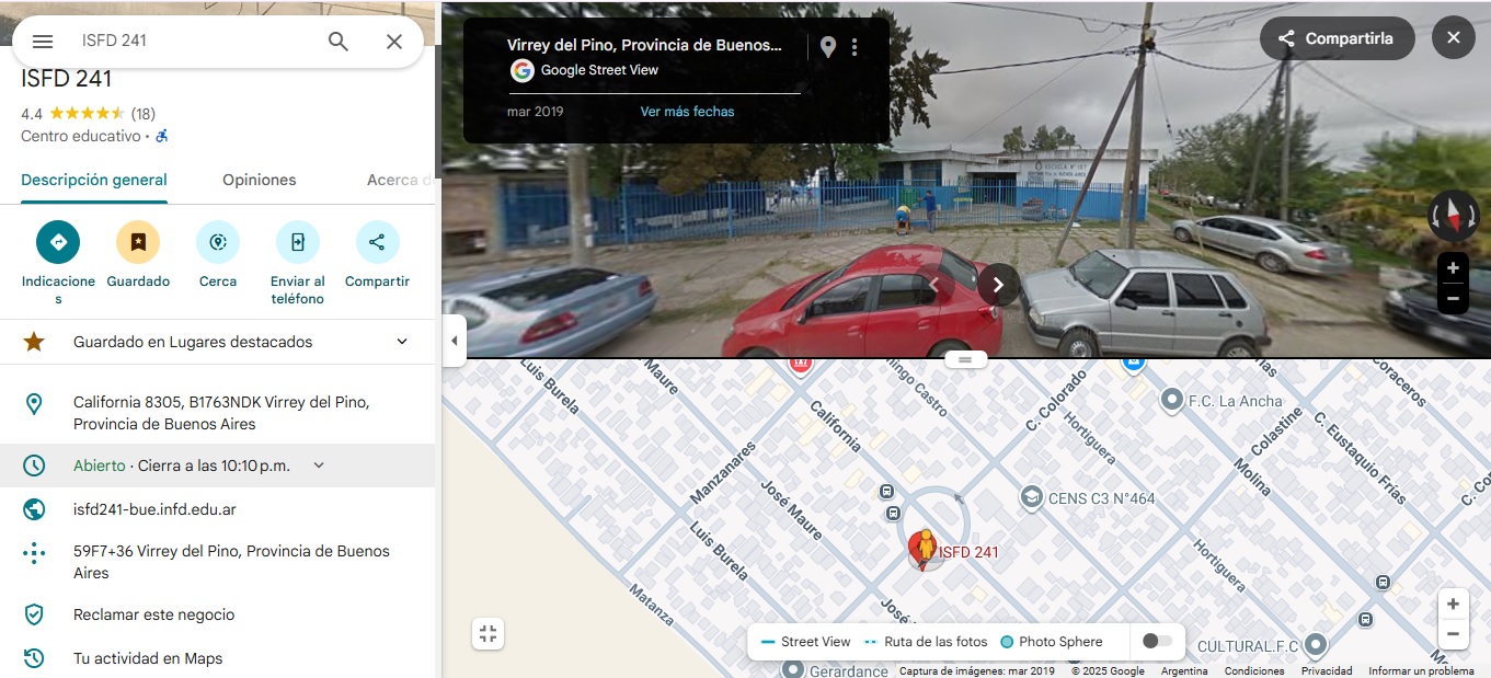 Instituto Superior de Formación Docente N° 241 Facebook Instagram Dirección California 8305 Virrey del Pino La Matanza Buenos Aires Horarios de funcionamiento Lunes a viernes de 17,40 a 22.10 hs ISFD 241 – California 8305 – Virrey del Pino